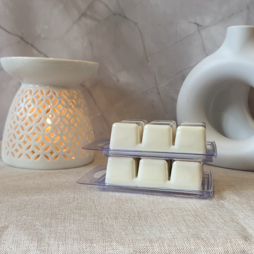 6 cube soy wax melts, crafted from 100% natural soy wax for a clean, long-lasting burn. Each melt is infused with high-quality fragrance oils, delivering a rich and soothing aroma to any space.